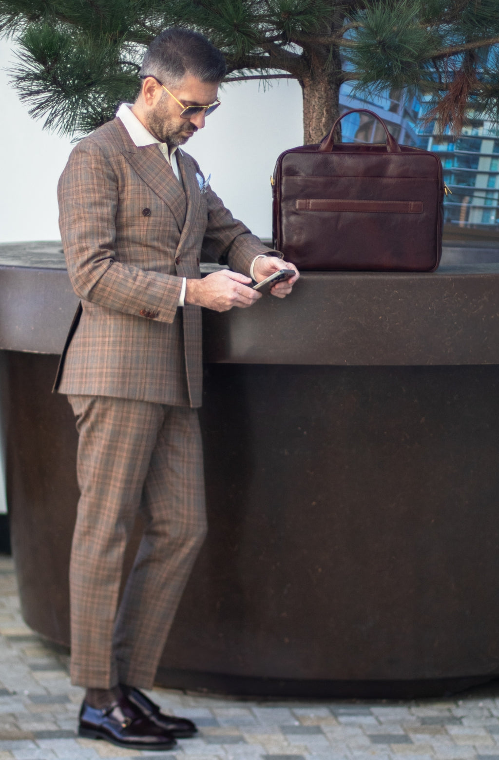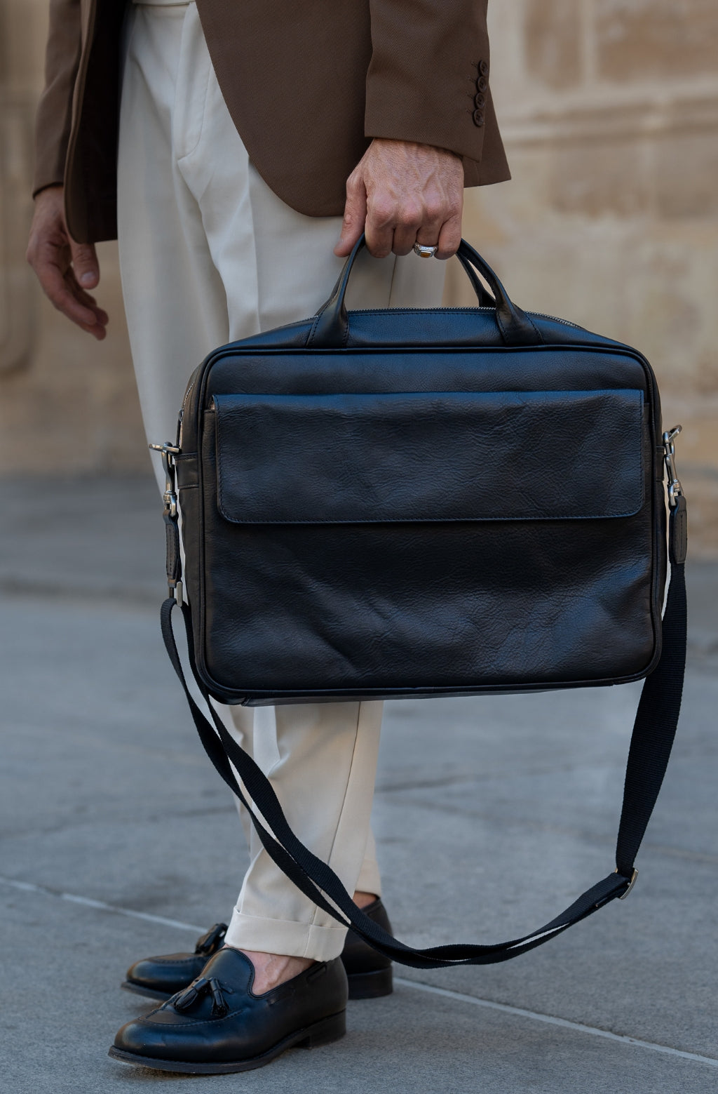 The Sheltering Sky - this leather briefcase is a great companion on the way to work or study. Its solid appearance is just perfect for both men and women's needs. Made from full-grain Italian leather, it comes with a trolley strap and a detachable shoulder strap, making it perfect for travel. The spacious compartments easily fit legal-sized paper, A4 documents, and folders, and it also has room for a 15-inch laptop. If that is not enough - we made an additional pocket with a flap on the front with an extra-strong magnetic closure ideal for keeping your essentials easily accessible.